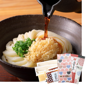 一番だし汁を使用した風味豊かな常温保存の【特製天かす】付。半生麺とぶっかけうどんのたれのセット。