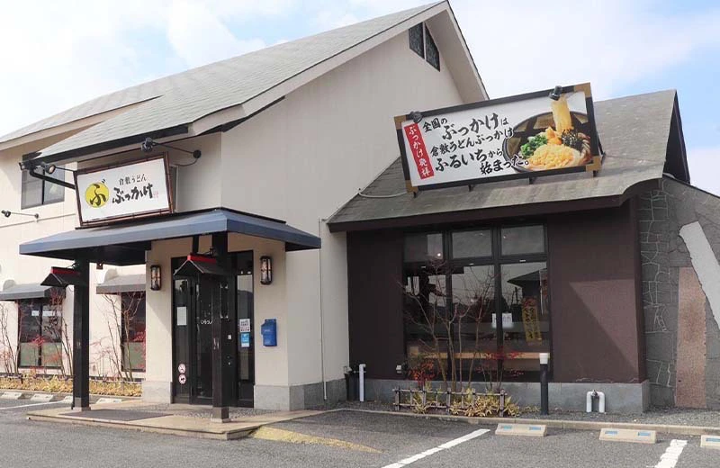 ぶっかけふるいち金光店は、浅口市金光町・JR金光駅から車で約5分の場所に位置し、国道2号線からもアクセスしやすくお車でのアクセスが便利です。