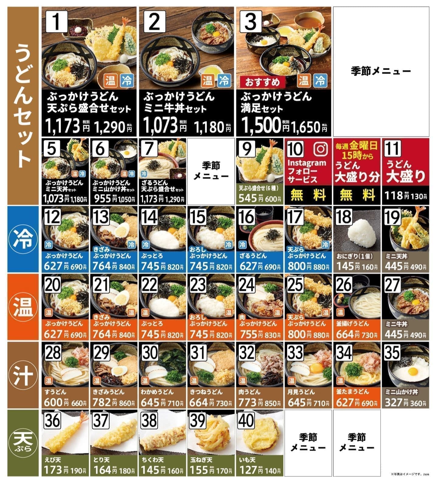名物の「ぶっかけうどん」に加え、揚げたてサクサクの天ぷらが楽しめる「天ぷら盛合せセット」や、ボリューム満点の『満足セット』や天丼、牛丼のセットなどうどんとの組み合わせが楽しめるセットメニューを豊富にご用意しています。