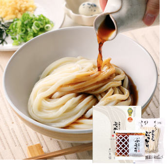 モンドセレクション5年連続最高金賞受賞。本格半生麺とぶっかけうどんのたれのセット。お土産に最適な化粧箱入です。